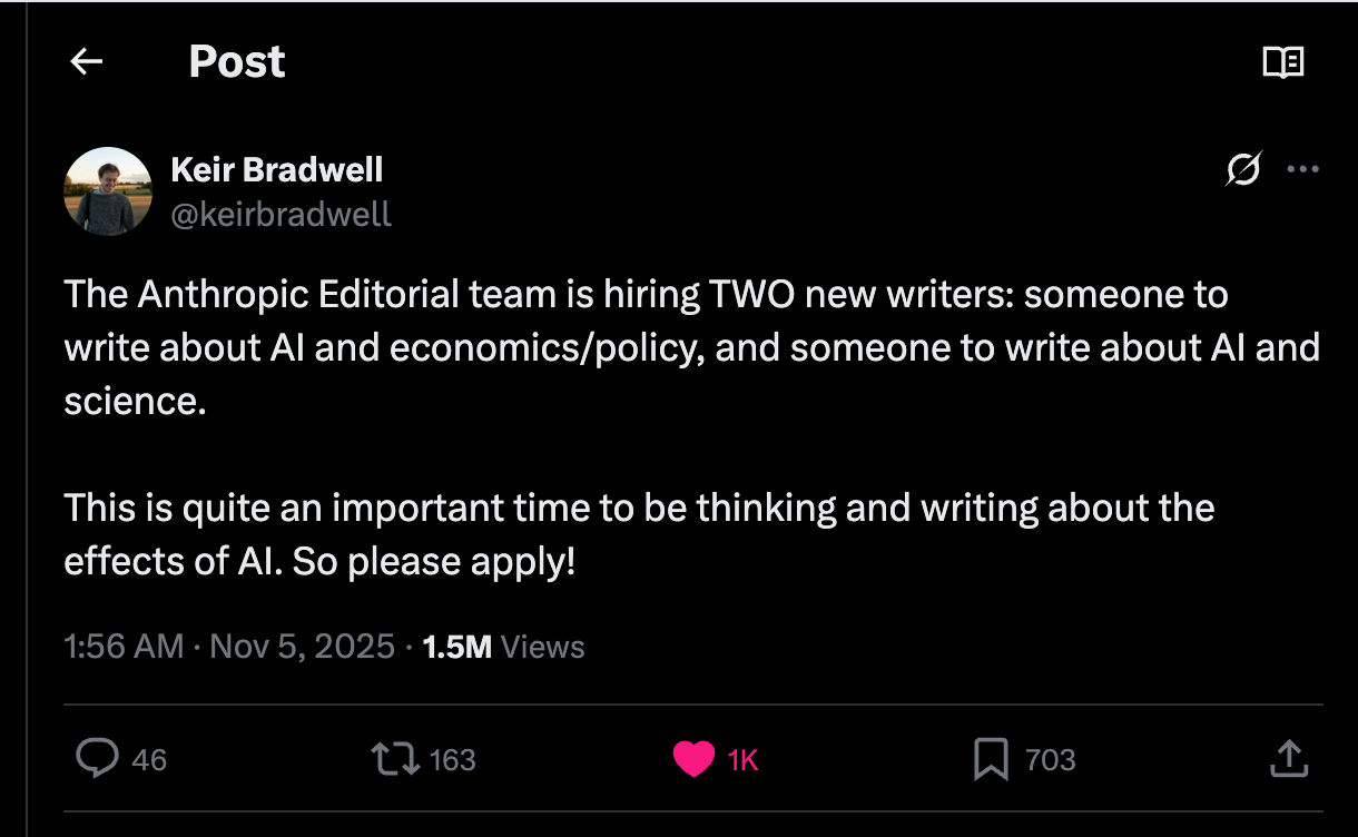 Anthropic announced this past week a couple of job openings for writers, with starting salaries north of $200,000.