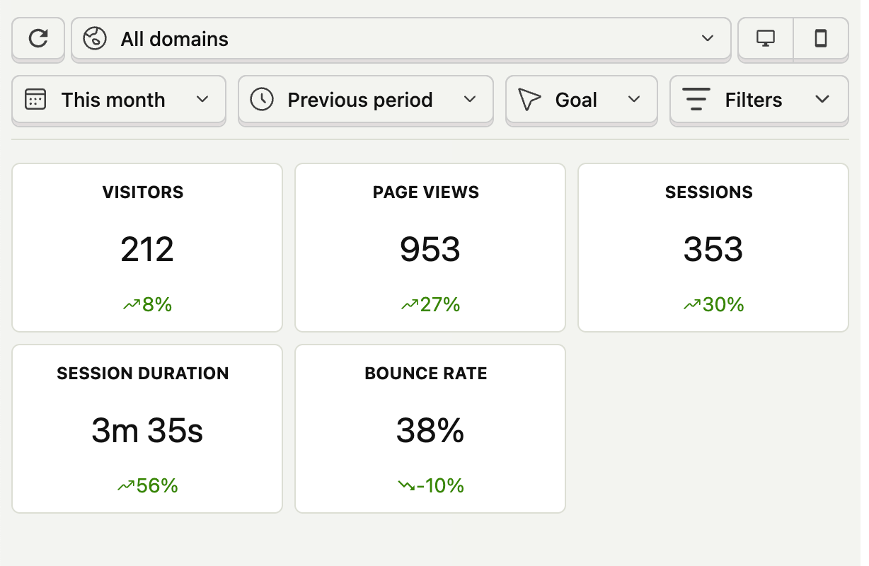 Every metric is an improvement over last month (that’s what those green numbers mean). On average, 72% of visitors don’t just bounce after viewing the first page.
