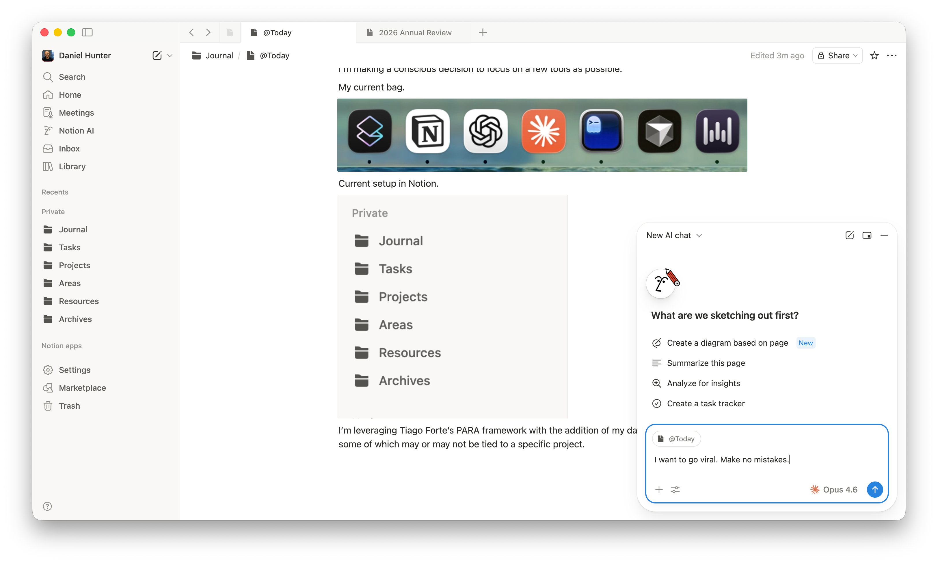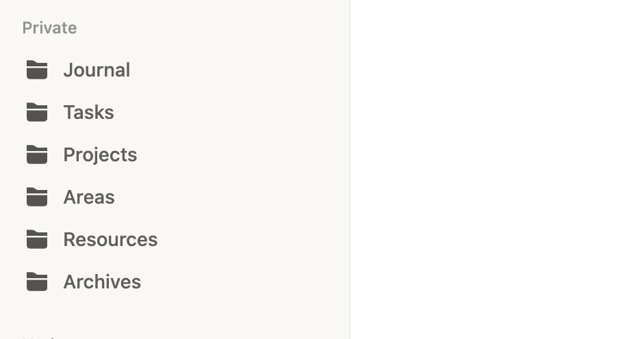 I’m leveraging Tiago Forte’s PARA framework with the addition of a daily Journal plus a Tasks database.