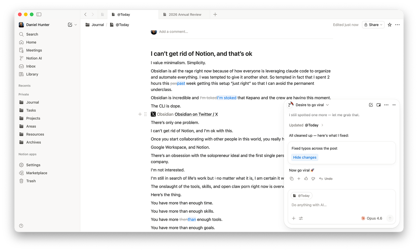 I expect to do the majority of my “knowledge work” in Notion moving forward. I don’t use Notion Agent at the moment, but a massive upgrade is coming next week.